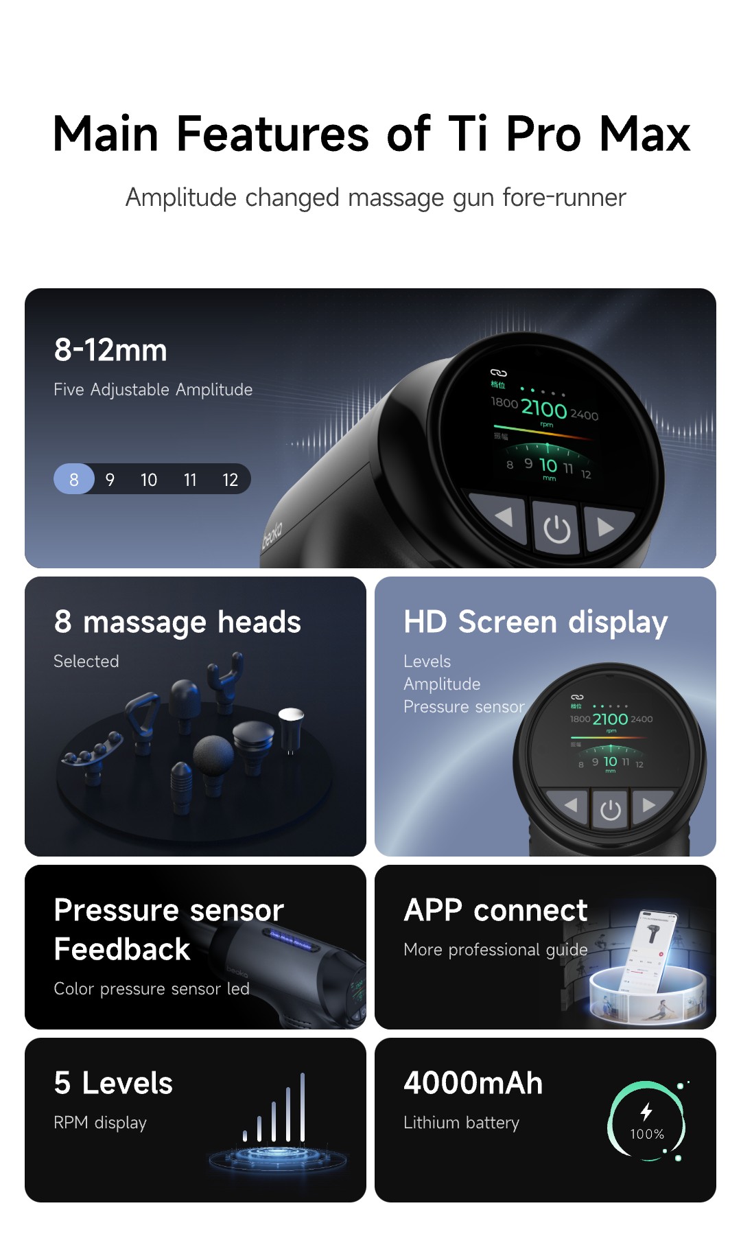 Bằng cách kết hợp nhiều cài đặt biên độ vào một thiết bị Ti Pro Max loại bỏ nhu cầu mua các thiết bị riêng biệt, tính năng này giúp bạn kiểm soát tốt hơn cường độ và độ sâu của máy massage đáp ứng nhu cầu đa dạng của gia đình phù cho mọi thành viên ừ massage nhẹ nhàng để thư giãn hay cần giãn cơ sâu – phục hồi cơ.